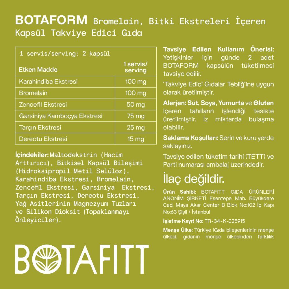 Bromelain, Karahindiba Ekstresi, Zencefil Ekstresi, Garsiniya Ekstresi, Tarçın Ekstresi, Dereotu Ekstresi.