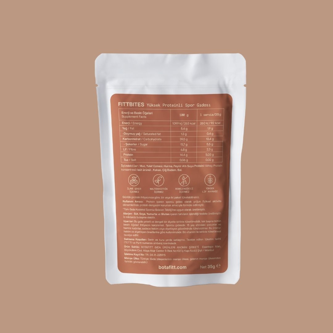 İçindekiler: Muz, yulaf ezmesi, hurma, whey proteini, kakao, çiğ badem, bal.