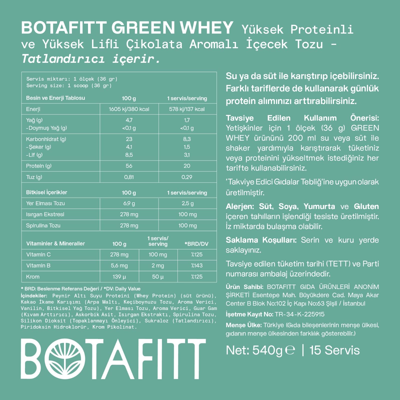 Bir porsiyonda 20 gr WHEY Proteni, Zengin Lif kaynağı (İnülin), Spirulina, Isırgan Otu, Krom pikolinat. (GMP, FDA, BRCGS sertifikalı üretim tesisinde üretilmektedir)