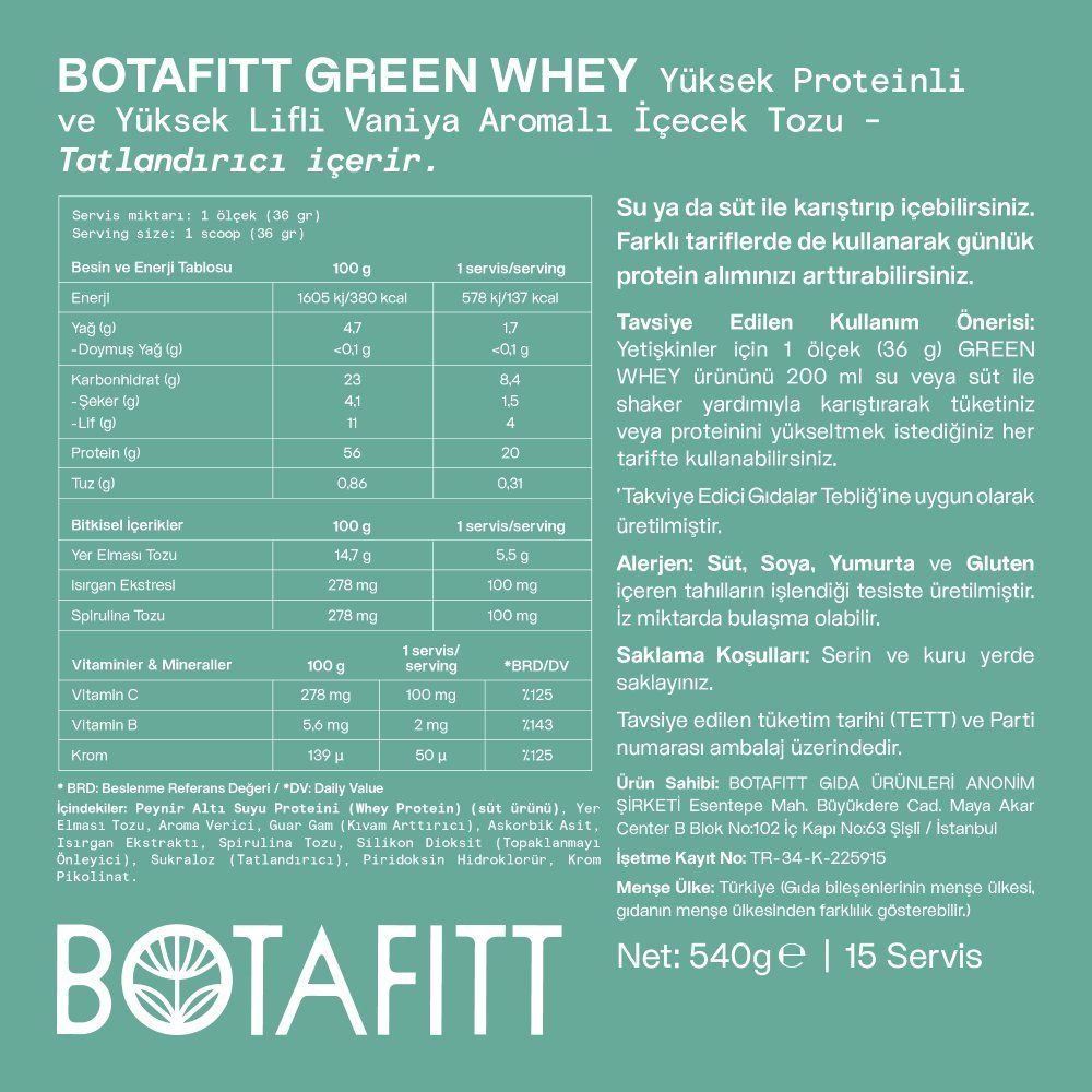 Güne protein içeriği yüksek bir içerikle başlamak, günlük beslenme düzeninizin zenginleştirilmesi için ideal bir seçenektir. Green Whey, 20 gr whey proteini ile tüm esansiyel aminoasitleri içerir. Spirulina ve ısırgan ekstresi ile zenginleştirilmiştir. Prebiyotik inülin, C vitamini ve B6 vitamini içerir. Ek olarak krom pikolinat içerir.